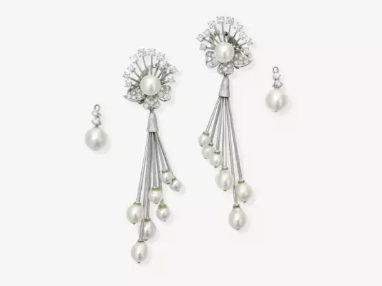 White gold 585/-, hallmarked. 58 small brilliant-cut diamonds totalling approx. 3.59 ct., fine white, G, VVS 1, very good brilliance. 4 large cultured pearls, round, diameters approx. 9 - 10.09 mm, colour: white with very good lustre, 8 small round cultured pearls, diameters approx. 5.5 - 6.5 mm, colour: white - light cream with good lustre, 6 teardrop-shaped cultured pearls, diameters approx. 10.6 x 10.2 mm, colour: white with very good lustre. Long pendant length approx. 8 cm, width approx. 2.5 cm, small pendant length approx. 1.8 cm, single clips approx. 2.7 x 2.5 cm. 39.78 g.
