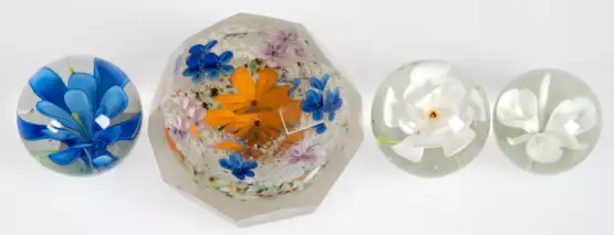 Лот 621 | 4 diverse Paperweights, davon 3x farblose abgeflachte Glaskugeln und 1x facettiert geschliffen (best.), mit farbigen Einschmelzungen in Blütenform, Dm. 4,2 cm - 8 cm