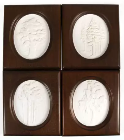 Лот 405 | 4 Meissen-Plaketten mit Baum-Reliefs, Tanne, Birke, Eiche und Kiefer, Biskuitporzellan, weiß, blaue Schwertermarke, 1. Wahl, bez. "Meissen Club Edition limitierte Auflage", je 10x12,5 cm, im Holzrahmen, ges. 15…