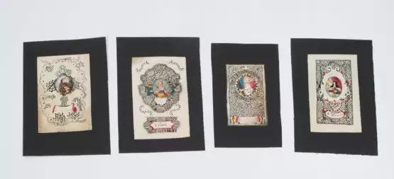 Süddeutsch, 18.Jh. Pergament geschnitten, gestichelt und genadelt, partiell gouachiert und tlw. in Silber- und Goldbronze gehöht. Zentrale Gouacheminiaturen mit entsprechenden Schriftkartuschen. Feiner Spiralranken-, Ästchen- und Netzmaschenschnitt mit Blumen bzw. mit Quadrillagen (Bernhard). 10x5 cm, 10,5x6,5 cm, 11x6 cm und 9x5 cm (Schnitt). Ungerahmt.