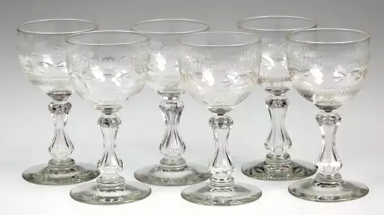 Лот 660 | 6 Likörgläser, farbloses Glas, mit umlaufenem Wellendekor und Schliff, H. 11 cm
