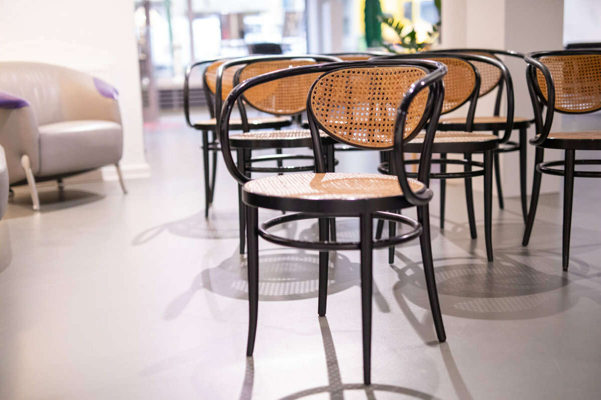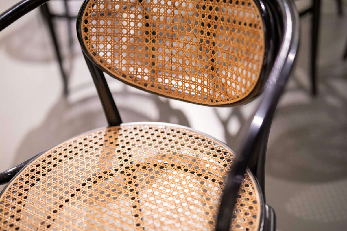Bentwood frame in black lacquer with natural Viennese cane, underside stamped ''THONET82 210'' and ''HST'', each approx. 80 × 43 × 49 cm, seat height approx. 46 cm, minor signs of age and use, cane seats slightly indented, one seat restored in a lighter tone