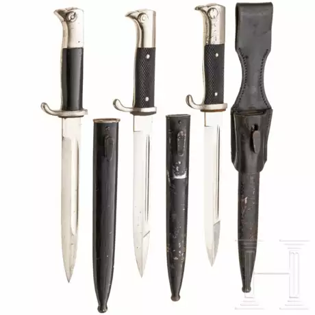 Drei Seitengewehre KS98, alle mit Hersteller auf der Klinge, bei einem SG wurden die Griffschalen ersetzt und die Scheide nachlackiert. Kurze Ausführung. Bei einem SG ist der Koppelschuh anbei. Alters- und Gebrauchsspuren.