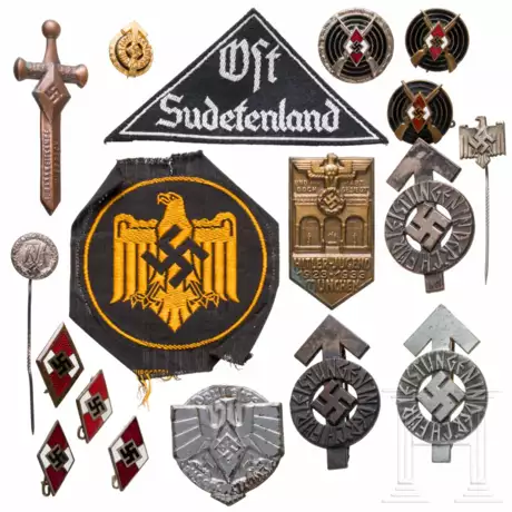 BDM-Gebietsdreieck "Ost Sudetenland" mit RZM-Etikett, drei HJ-Abzeichen, Goldenes HJ-Ehrenzeichen, Miniatur zum HJ-Führer-Sportabzeichen, Zwei HJ-Schießabzeichen, HJ-Scharfschützenabzeichen, drei HJ-Leistungsabzeichen in Silber, drei HJ-Veranstaltungsabzeichen mit "München 1923-1933", NSRL-Nadel, NSRL-Mitgliedsabzeichen (gewebt) für den Sportanzug und Reichsjugendsport-Abzeichen "RJA". Teils mit Hersteller/RZM. Insgesamt 18 Teile.
