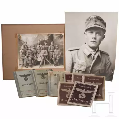 Fünf Arbeitsbücher und vier Wehrpässe. Darunter zwei Gebirgsjäger, einer davon diente in Finnland. Standard-Einträge. Anbei ein großes Portraitfoto eines Gefreiten, Maße 26 x 33 cm, sowie ein Gruppenfoto von österreichischen Soldaten, Maße 22,5 x 17,5 cm. Alters- und Gebrauchsspuren.