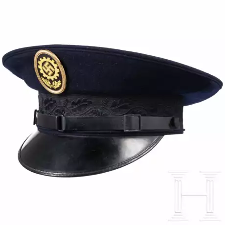 Vorschriftsmäßige Ausführung aus nachtblauem Tuch, das schwarze Besatzband ein umlaufendem Eichenlaubdekor, gewebtes DAF-Emblem, silbern geprägtes DAF-Emblem auf dem Mützentrapez. Dazu eine allgemeine Armbinde und zwei Trägerphotos, eines Besatzungsmitgliedes der „Monte Olivia".