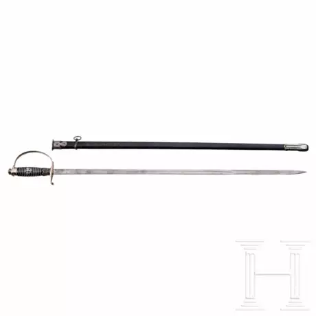 Maker WKC, Solingen, polished steel blade with manufacturers logo, SS runes stamped on reverse. Nickel-plated hilt and crossguard, numerical “3” stamp on underside. Black wood-stained grip with wire wrap and inset Police eagle with wreathed swastika. Blade washer missing. Black lacquered scabbard with silver fittings, wear to paint. Length ca. 96 cm.