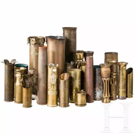 Ca. 28 u.a. zu Vasen umgearbeitete deutsche und ausländische Kartuschen mit punzierten, geritzten, getriebenen oder geschmiedeten Verzierungen. Teils auch nach 1945, mit Gebrauchsspuren/Fehlstellen. Höhe 10 - 40 cm. Gewicht 19 kg. Versandkosten eventuell höher als Objektpreis.