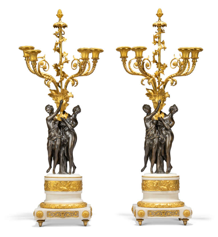 Лот 141 | A PAIR OF LOUIS XVI FOUR-LIGHT ORMOLU-MOUNTED PATINATED-BRONZE AND WHITE MARBLE CANDELABRA