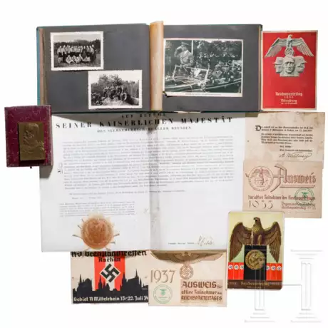 Kleines Fotoalbum "Westerwald 1937" mit ca. 15 kleinformatigen, teils beschädigten Fotos und Bildchen. Dazu beschädigte Ausweise, Postkarten und weitere Bildchen, eine Einsteckhülle für eine Kartentasche, eine deutsch-russische Urkunde aus Dorpat von 1853 und eine Plakette "Leopold - Fürst von Hohenzollern" im Etui.