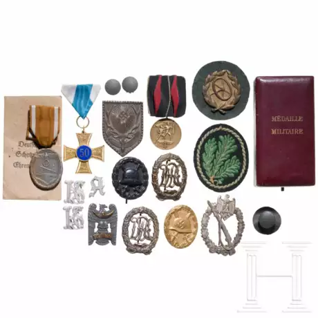 ISA in Silber, VWA in Gold (Buntmetallausführung, "L/54" = Schauerte & Höhfeld, Lüdenscheid), Medaille 1.10.38, Sportabzeichen "DRA" in Bronze und Silber, ein Schlesisches Bewährungsabzeichen 1. Klasse, ein Abzeichen der Deutschen Jägerschaft "Jagdaufseher" u.a.