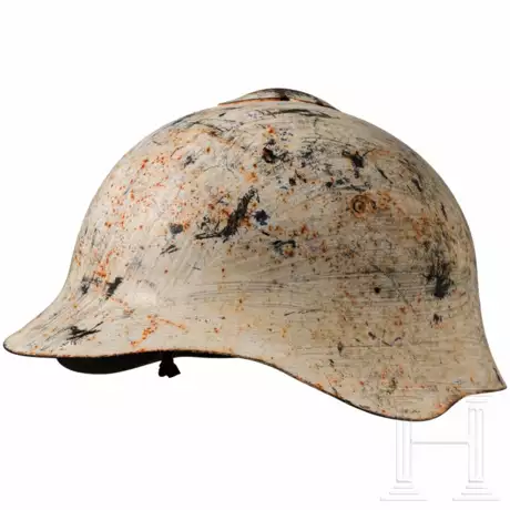 Einteilige Glocke mit aufgesetzter Belüftungsabdeckung im Scheitel, außenseitig weiß überstrichen. Ersetztes Textilfutter (Doppellöcher), im Nacken unleserliche Stempelung.