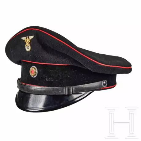 Cap body in dark blue wool, black velvet cap band, red piping, black leather chinstrap with metal buckles, attached by two black smooth finish buttons. Silver-finish metal eagle with gilt crossed hammers, metal wreath and cockade with red cloth insert. Black lacquered visor with brown, checkered finish underside. Orange-brown cloth lining, moisture shield intact, manufacturer mark “Gädicke Saarbrücken”. Brown leather sweatband, owner’s initial discs “HS” attached. Size ca. 55.