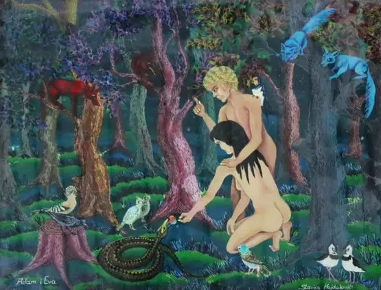 Naive Hinterglasmalerei von Slavica Hajdwkovic um 1980. 34 x 44,5 cm. Unt. re. sign. Unt. li. bet. Gerahmt.