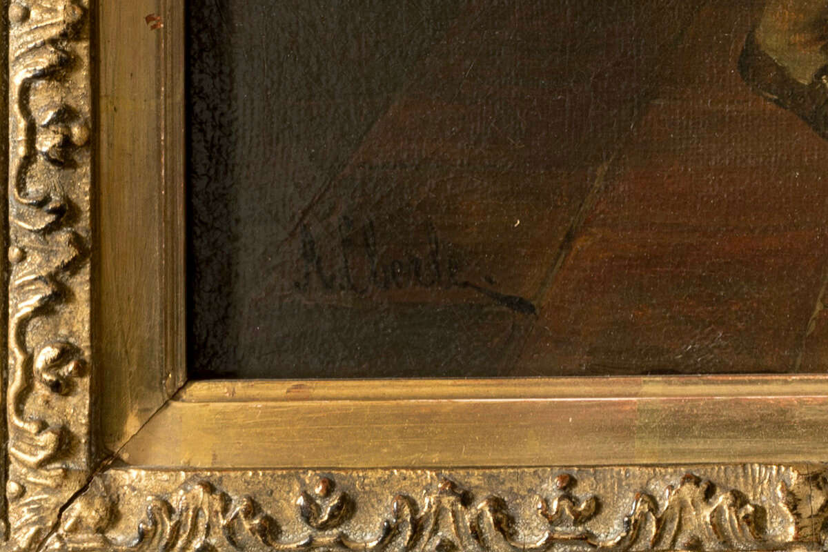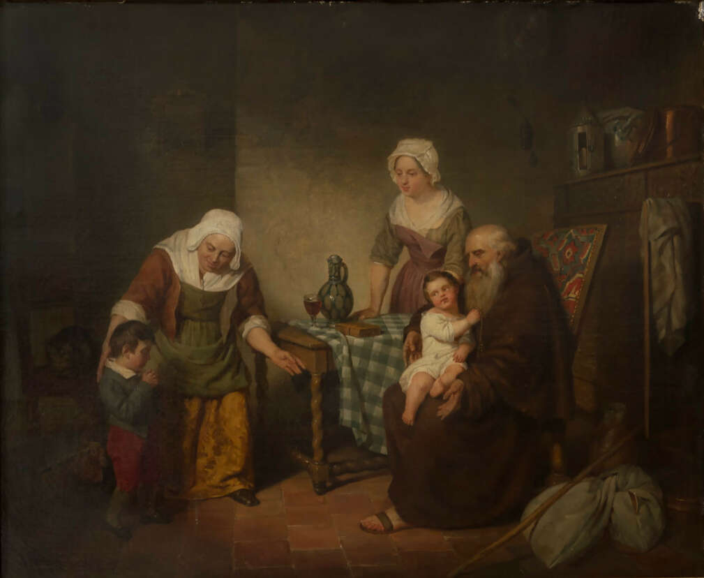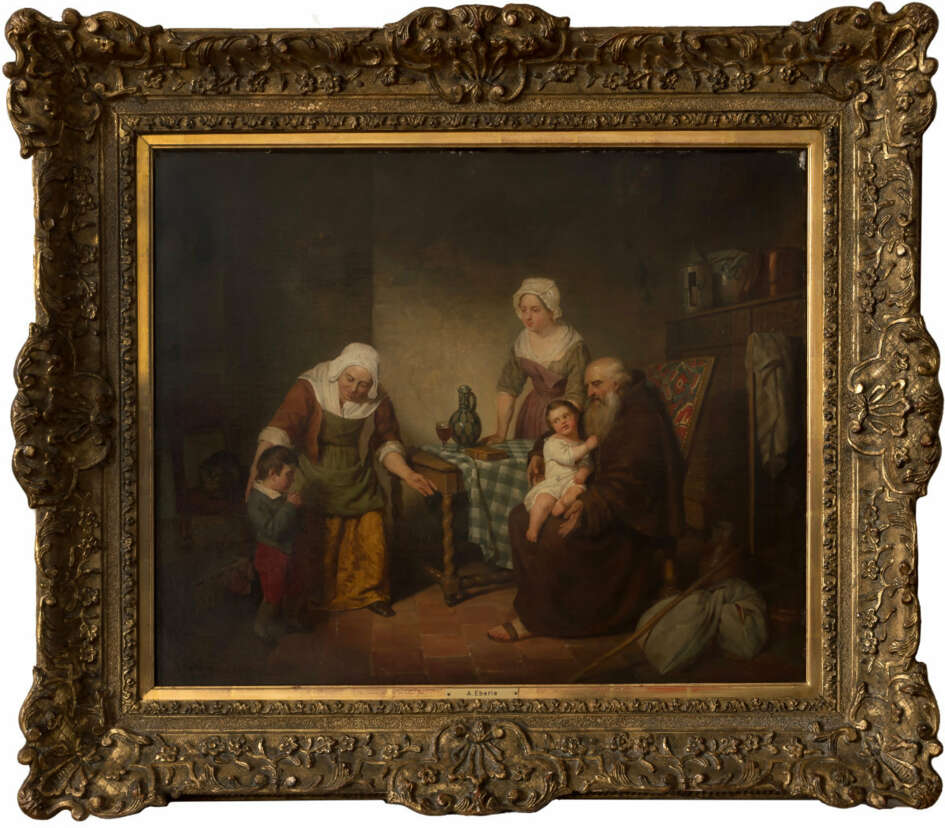 A visiting monk, oil on canvas, 53,5 x 64 cm canvas dimensions, signed, relined, craquelure, restored, retouched, upper right corner damaged