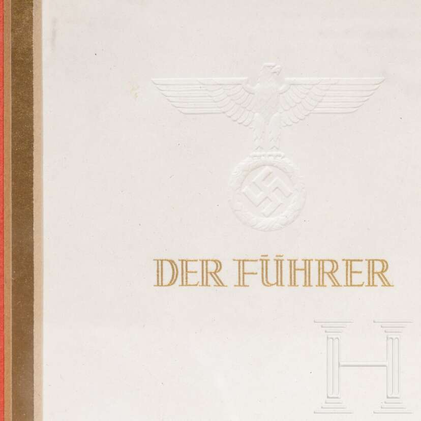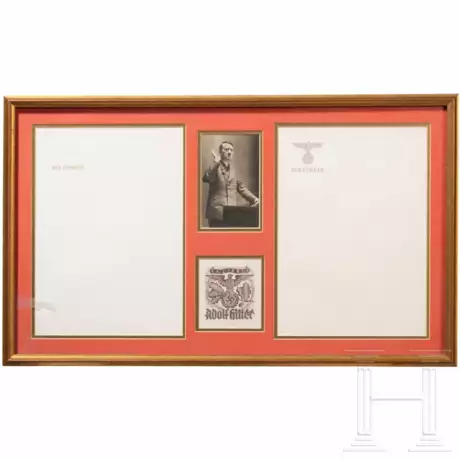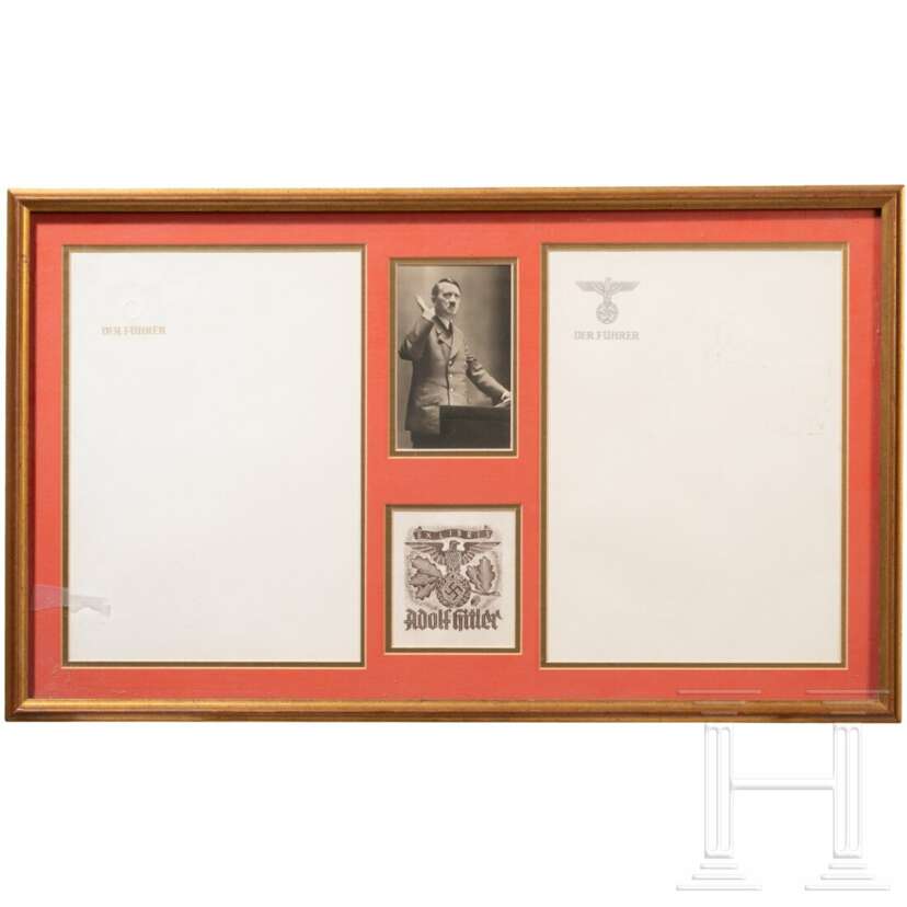 Das Exlibris auf Büttenpapier, in Brauntönen gehaltener Hoheitsadler auf Eichenbruch, darüber Bandeau "Ex Libris", darunter Namensbezeichnung. Maße 10 x 9 cm. Ein Briefbogen mit blindgeprägtem Hoheitsadler über "Der Führer" in erhabenem Gold. Der andere Bogen mit Hoheitsadler und "Der Führer" jeweils in erhabenem Schwarzbraun. Jeweils DIN A 4. Gemeinsam mit einer Portraitpostkarte Hitlers unter Glas, in Passepartout und gerahmt.