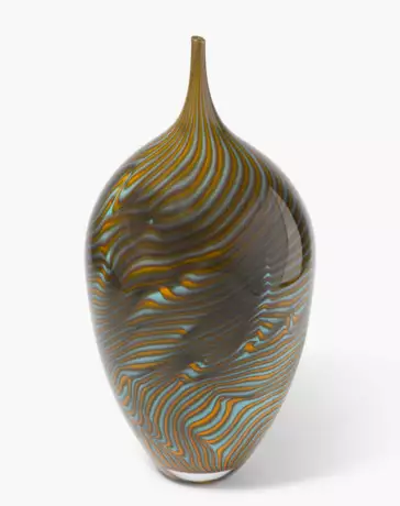 Um 2000. Farbloses Glas mit marmorierten, bernsteinfarbenen, braunen und petrolfarbenen Einschmelzungen. Im Stand signiert "Schiavon by Afro" (graviert). H 42 cm.