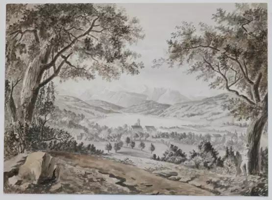Blick auf die Gemeinde Sattel mit der See im Mittelgrund. Aquarell, 20. Jh. 33 x 45,5 cm.