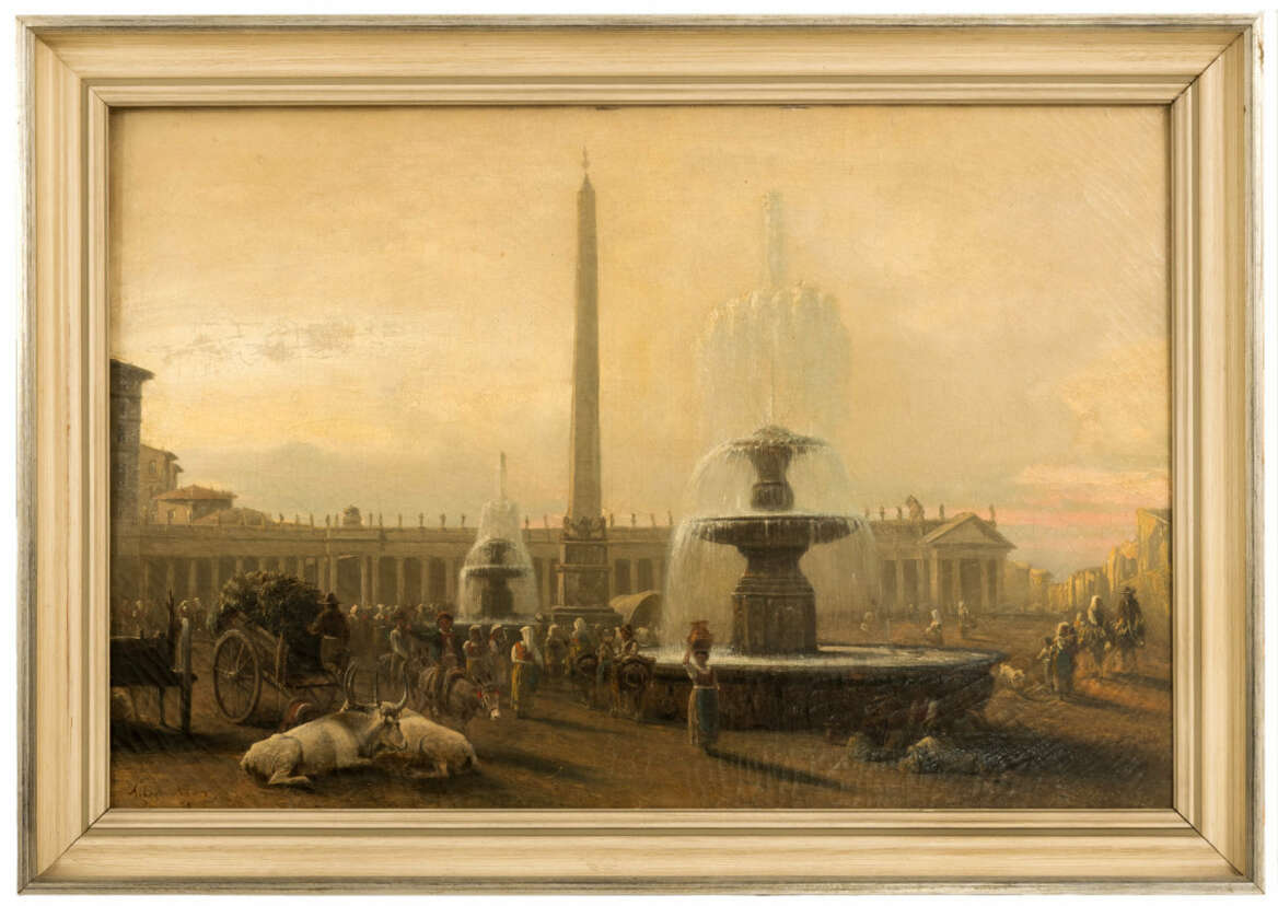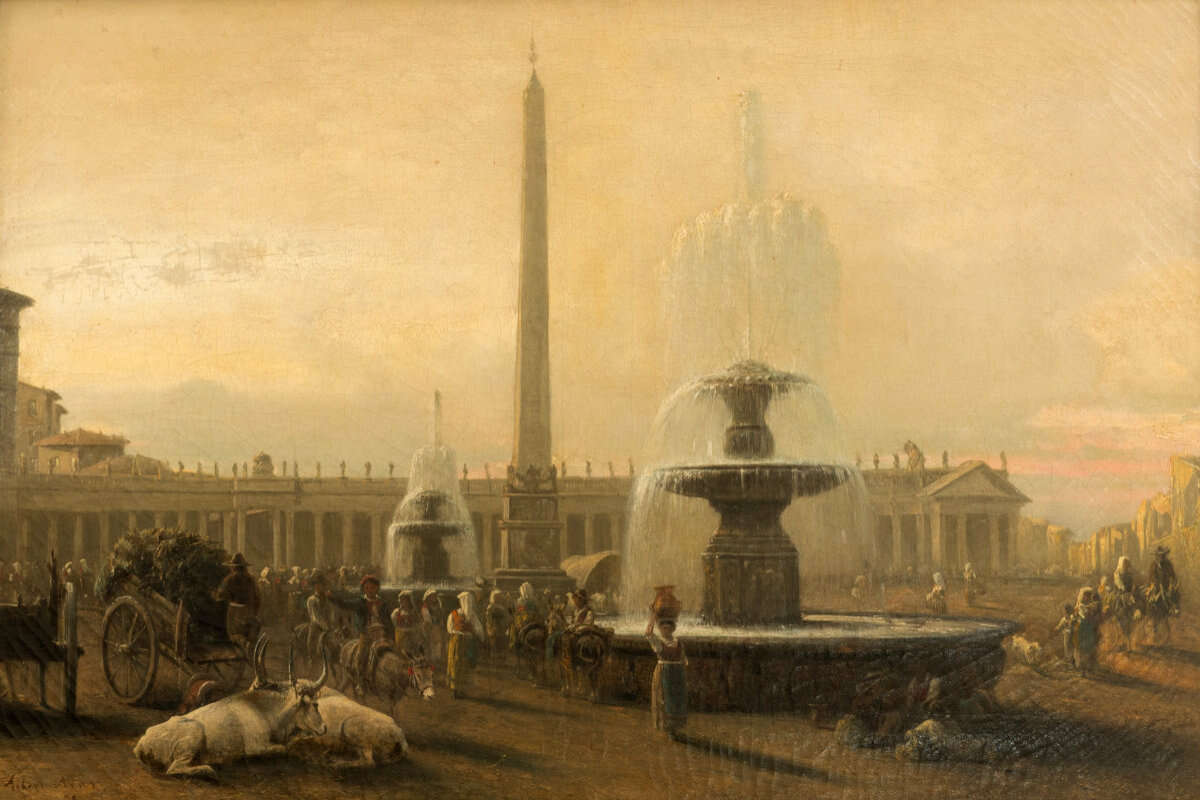 Animated St. Peter's Square in Rome, oil on canvas, 64 x 93.5 cm canvas dimensions, signed, dated 72, relined, craquelure, some small colour flaking, minimal staining, rubbing to the edge due to the framing, irregular colour difference in the upper left area