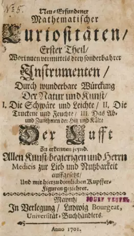 Holzmann-B. I, 10383b. Vgl. Bibl. Dt. Mus., Libri rari 6 u. Wellcome II, 28. - Zweite deutsche Ausgabe (erstmals 1697) der Zusammenfassung der beiden bedeutenden und umfangreichen Abhandlungen ("Traittez des barometres, thermometres..." u. "Traite de l'aiman") von Joachim D'Alencé über die Barometer, Thermometer und Hygrometer sowie über den Magneten. - Die Kupfer zeigen, vor allem im ersten Teil, nicht nur Instrumente, sondern oft auch Forscher bei der Anwendung. - Etw. gebräunt, fleckig u. wasserrandig, Titel mit kl. Namenstempel, im 1. Teil Randläsur durch Wurmgang (Titel u. Vorsatz etw. stärker), Ebd. berieben.