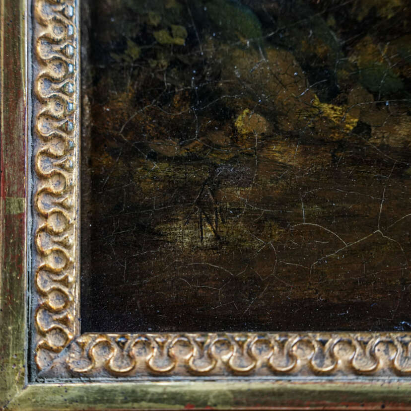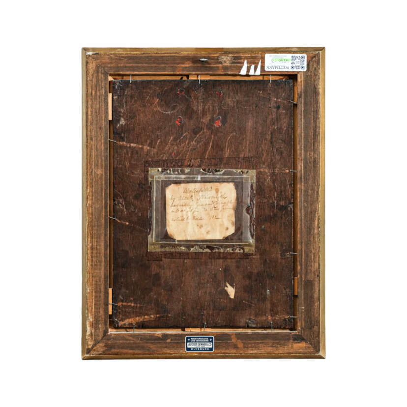 Waterfall, oil on panel, 39 × 28.5 cm, signed, age-related craquelure, verso old label with picture information; label of the art gallery August Genner & Co., Duisburg
