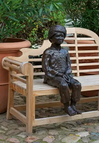 Bronze, dunkelbraun patiniert. Leicht unterlebensgroße, naturalistische Darstellung eines sitzenden Knaben mit Turban. Alexandra Gestin, in Frankreich geboren und durch Afrika- und Asienreisen von den verschiedenen Kulturen der Welt inspiriert, ist vor allem für ihre natürlichen bis abstrakten Skulpturen von Sumoringern bekannt, behandelt mit ihrer Kollektion "Enfants du Monde" aber auch Kinder verschiedener Herkunft in ihrer charakteristischen Kleidung. Sign. "ALEXG", num. "5/8" und Gießerstempel "R.Harze. Ore per que". H. 92 cm.