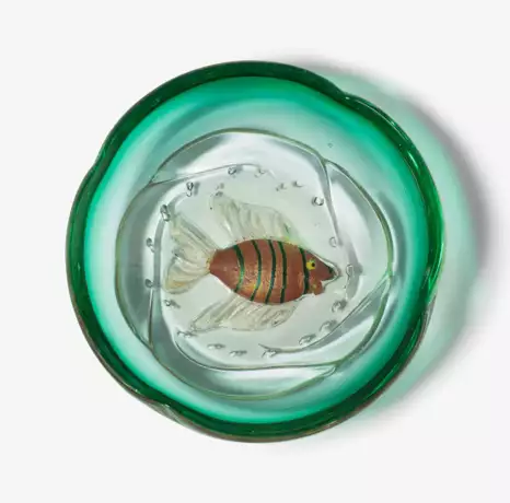 Um 1960. Farbloses Glas im Verlauf grün überfangen. Im Spiegel eingestochene Luftblasen und bunte Glaseinschmelzungen mit fein zersprengter Goldfolie in Form eines Fisches. Unbezeichnet. D 16,5 cm.