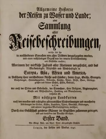 Cox I, 32; Landwehr, VOC 268. - Einzelband der deutschen Ausgabe der großen Reisesammlung, hauptsächlich über die Reisen der Portugiesen u. Engländer nach Ostindien, mit großer Berücksichtigung Afrikas. Schwabes Übers. beruht wesentlich auf der franz. Bearbeitung durch den Abbé Prévost. Mit Karten (überwiegend von Bellin) der Küsten Afrikas, von Arabien, Ostasiatische Inseln, Japan etc. und den meist fehlenden Nachtragskarten Atlantischer Ozean (2), Indischer Ozean, Ostasien, Westeuropa. - Gleichmäßig schwach gebräunt, kaum stockfleckig, hinteres fl. Vorsatz erneuert.