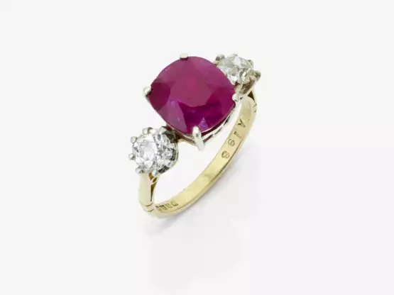 Yellow gold 18 hallmarked (750/-), with additional British hallmarks. 2 old-cut diamonds totalling approx. 0.66 ct., slightly toned white, I-J, SI 1-2. 1 faceted deep red cushion-cut ruby of 4.03 ct., Burma (Mogok, Myanmar), unheated. In good to very good condition, with minor signs of wear and tear to the gold surface. Ringsize: 53.5. Ca. 4.37 g.