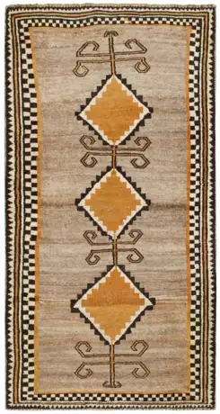 Persien. Um 1950. Wolle auf Baumwolle. Im beigefarbenen, abraschierten Innenfeld drei gelbgrundige, gereihte Rautenmotive. Umlaufend mehrteilige Bordüre mit schwarz-weißem Würfelband. 243 cm x 125 cm.