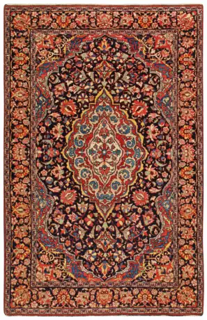 Persien. Wolle auf Baumwolle. Im dunklen Innenfeld gestrecktes, hellgrundiges Zentralmedaillonsowie passig geschweifte Ecklösungen. Flächendeckende Musterung aus Palmettenranken sowie umlaufend korrespondierende Bordüre. 133 cm x 200 cm.