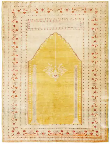 Türkei. Um 1940-1950. Seide auf Seide. Auf zitronengelbem Fond schlichte Nische mit Ampelmotiv und Säulenpaar. Umlaufend breite, mehrteilige, cremefarbene Bordüre mit hellrotem Blütendekor. 160 cm x 122 cm.