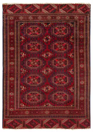 Turkmenistan. Mitte 20. Jh.; Wolle auf Wolle. Im roten Innenfeld zwei Reihen à fünf Göls und Rautenmotive im Rapport. Umlaufend breite Ornamentbordüre. 169 cm x 120 cm.