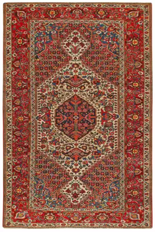 Persien. 1920er Jahre. Wolle auf Baumwolle. Auf dichtgemustertem Blütenfond im Rapport elfenbeinfarbene Reserve sowie rautenförmiges, dunkelgrundiges Zentralmedaillon mit Anhängern. Flächendeckende Palmettenmusterung und hellblaue Ecklösungen. Umlaufend breite, hellrote Palmettenbordüre. 210 cm x 138 cm.