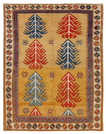 Wolle auf Wolle. Im beigefarbenen Innenfeld Musterung aus großen Palmettenmotiven in Rot und Blau sowie kleinen Sternen im Rapport. Umlaufend cremefarbene Bordüre, begrenzt von schmalen Bändern. 165 cm x 127 cm.