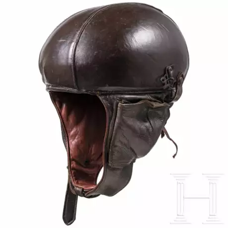 Leichte, mit braunem Leder bezogene Glocke mit zwei Belüftungsnieten, seitliche Metallbügel (für die Sauerstoffmaske?), angesetztem Nackenschutz und Ohrenklappen. Braunes Laschenfutter. Größe 57.