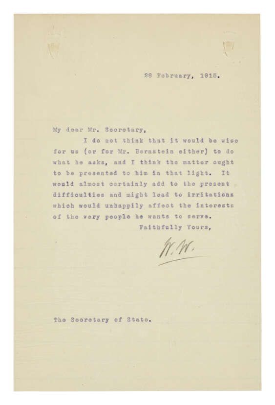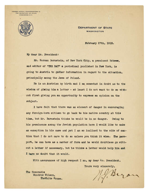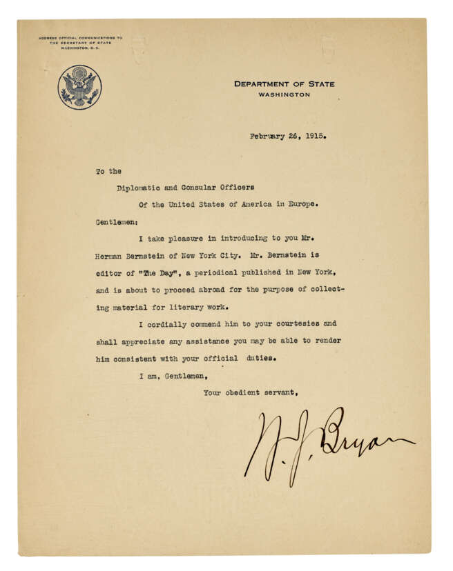 A wide-ranging political archive pertaining to the Panama Canal, negotiations with the Haitian government, and European anti-Semitism during World War I, consigned by a descendant of William Jennings Bryan. Notably, three letters pertain to the Jewish activist and editor of "The Day" Herman Bernstein and his travel to Europe to document the situation of Jews in the war zones of World War I. The first, a 26 February 1915 letter from Secretary of State Bryan to the Diplomatic and Consular Officers of the United States of America in Europe, requests their support for Bernstein as he proceeds abroad "for the purpose of collecting material for literary work". However, this letter of support was likely never sent, as a letter from Bryan to Wilson one day later asks Wilson for his opinion, stating "he is Austrian by birth… I have felt that there was an element of danger in encouraging any foreign-born citizen to go back to his native country…owing to his prominence among the Jewish population here I would like to make an exception and yet I am so inclined to the side of caution that I do not care to do so unless you think it wise. The passport, he can have as a matter of form and he would doubtless go without a letter if necessary, but he thinks a letter would help him and I have no doubt that it would." One day thereafter, Wilson responds that "I do not think it would be wise for us (or for Mr. Bernstein either) to do what he asks… it would almost certainly add to the present difficulties and might lead to irritations which would unhappily affect the interests of the very people he wants to serve."