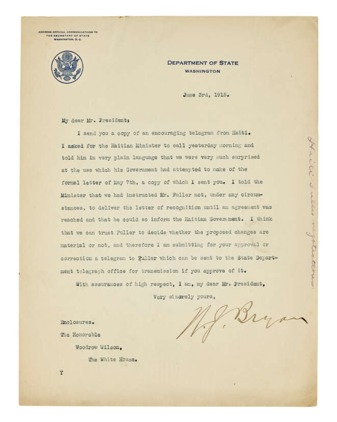 Finally, the archive also covers the special mission of Mr. Paul Fuller, Jr. - a U.S. envoy sent to Haiti to establish diplomatic relations between the two nations after a revolution led to the overthrow of its existing president - from May to June 1915. In an attempt to reinforce American interests, Fuller instructed the new Haitian government that the United States would not recognize nor assist the new administration unless Haiti accepted and signed the project of a new convention. In response, the Haitian government provided a counter-project with new conditions. In a 3 June 1915 letter to Wilson, Bryan encloses an "encouraging telegram from Haiti", adding "I told the Minister we had instructed Fuller not, under any circumstances, to deliver the letter of recognition until an agreement was reached...we can trust Fuller to decide whether the proposed changes are material or not...". One day later, Wilson replies: "This message to Mr. Fuller has my entire approval, and I hope it will be sent at once". One day thereafter, on 5 June 1915, Mr. Fuller would officially acknowledge the receipt of the Haitian communication regarding these modifications (Self-Determining Haiti, The Nation, 28 August 1920). [Provenance]: William Jennings Bryan - by descent to the consignor.