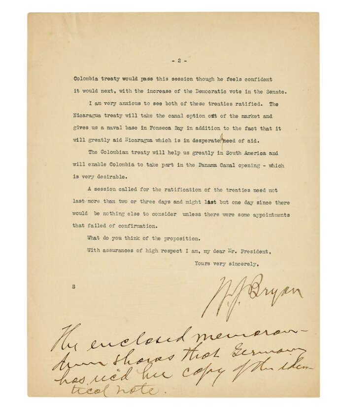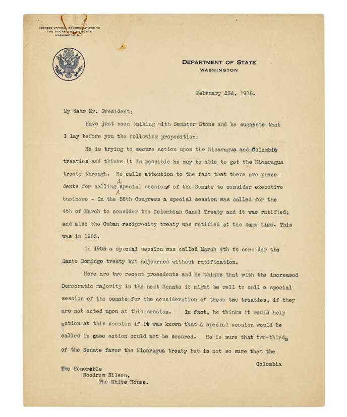 Another letter relates to the Thomson-Urrutia Treaty, which provided $25 million in reparations to Colombia for U.S. actions in building the Panama Canal in exchange for Colombia's recognition of Panama's independence. In a 23 February 1915 letter, Bryan writes to Wilson of a proposition pushed from Senator Stone, encouraging the President to call a Special Session of Congress to consider treaties with Colombia and Nicaragua. Bryan adds: "I am very anxious to see both of these treaties ratified. The Nicaragua treaty will take the canal option out of the market and gives us a naval base in Fonseca Bay... the Colombian treaty will help us greatly in South America and will enable Colombia to take part in the Panama Canal opening - which is very desirable." The Thomson-Urrutia Treaty was successfully negotiated and signed by the U.S. in April 1914, then ratified by Colombia in June 1914. However, the U.S. Senate would not ratify the treaty until 20 April 1921.