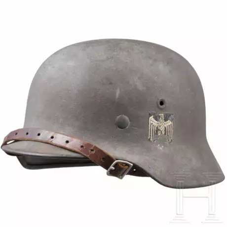 Graue Raulackierung mit körniger Textur, das Helmabzeichen zu ca. 60 % erhalten, feldgraue Lackierung innen, Herstellercode "EF64" (Emaillewerk AG Fulda) sowie Chargennummer "100 L69", komplett mit Innenfutter und Kinnriemen. Alters- und Tragespuren.