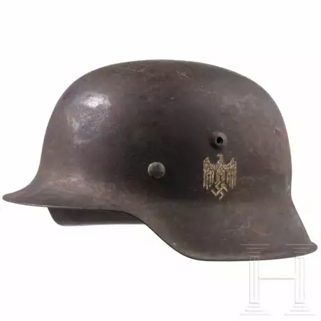 Die Glocke mit mitgeprägten Belüftungsnieten und ohne Randbördelung, außenseitig mit matter feldgrauer Lackierung (Alters- und Lagerspuren) und zu ca. 60 % erhaltenem Adlerschild. Innenseitig flugrostig mit Schlagstempelung "hkp" für die Sächsischen Emailler- und Stanzwerke in Lauter mit Größenangabe "66", Chargennummer "34619"(?). Das Innenfutter mit Farbspuren, der Kinnriemen mit flugrostigen Eisenteilen.