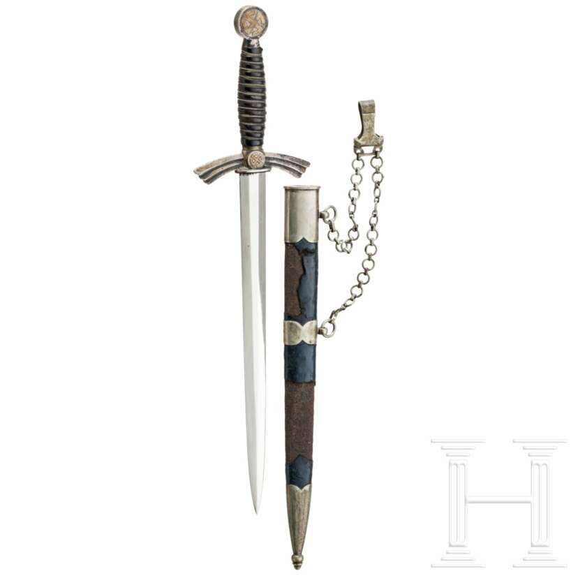 Frühe "schwere" Ausführung, die vernickelte Klinge mit geätztem Königslogo und Abnahmepunze. Versilberter Knauf und Parierstange mit eingesetzten goldenen Sonnenradmedaillons, blau belederter Griff mit Drahtwicklung. Die Scheide mit Resten der blauen Belederung, versilberten Beschlägen und Tragekette. Länge ca. 45 cm. Ungereinigt mit Alters- und Lagerungsspuren.