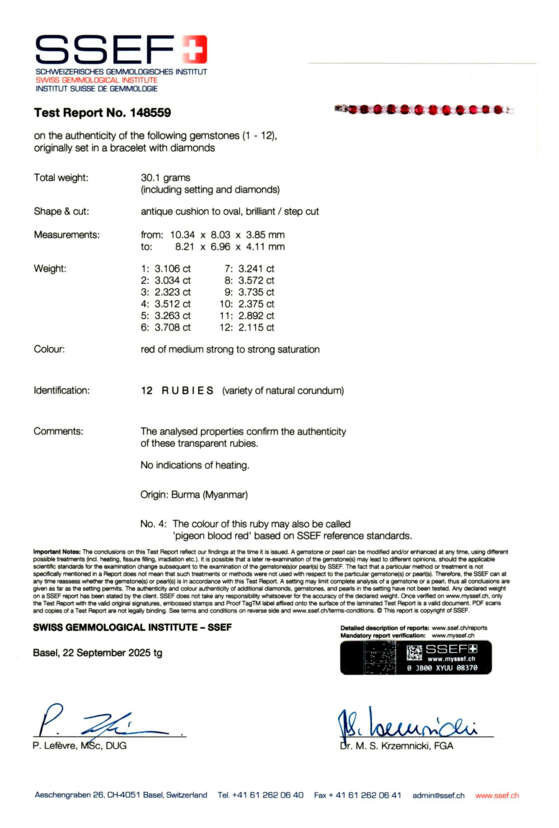 SSEF, 2025, report no. 148559: 12 rubies, 3.73 to 2.11 carats, Burma (Myanmar), no indications of heating, no.4 ruby 'pigeon blood red', 36.876 carats total