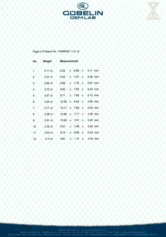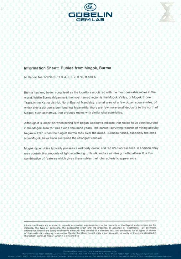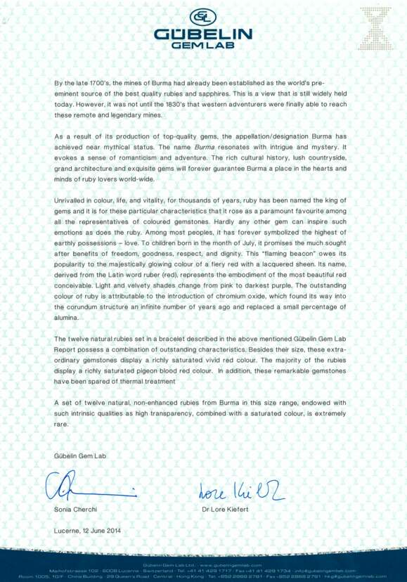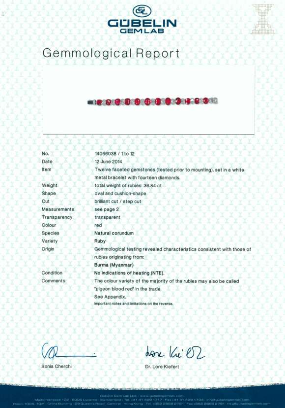 Gübelin, 2014, report no. 14066038/ 1 to 12: 12 rubies, Burma (Myanmar), no indications of heating, majority of the rubies may also be called 'pigeon blood red', 36.84 carats total, Appendix letter
