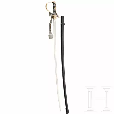 Vernickelte Stahlklinge mit Herstellermarkierung "Carl Eickhorn, Solingen", leicht fleckig auf beiden Seiten, schwarzer Kunststoffgriff mit intakter Drahtwicklung, vergoldetes Aluminiumgefäß mit Eichenlaub-Ornamenten, auf dem Parierlappen der Hoheitsadler, orig. schwarz lackierte Stahlscheide, diese ohne Dellen, anbei das Portepee. Länge Säbel 97 cm. Alters- und Gebrauchsspuren.