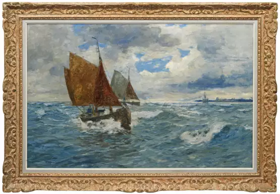 Als Sohn eines Kapitäns geboren, zog es Dirks immer wieder aufs Meer, er segelte sogar zweimal bis nach New York. Mit flottem Malduktus und atmosphärischer Wolkenschilderung angelegtes Seestück. Dirks studierte an der Düsseldorfer Akademie bei Eugen Dücker sowie an der Kunstschule in Weimar bei Leopold von Kalkreuth und Theodor Hagen. Öl/Lwd.; R. u. sign.; 80 cm x 116 cm. Rahmen.