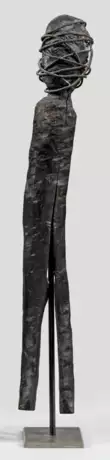 Halbplastische, stilisierte Darstellung eines Menschen durch ein ungleichmäßig gespaltenes Stück Holz, das ovale Kopfstück mit Draht umwickelt. Nach dem Studium der Malerei in Chile ließ sich Belmar in München nieder, wo er insbesondere von der Galerie Biedermann vertreten wird. Holz, Draht, mit rücks. Hängeöse und Metallständer. H. 65 cm. Ges.-H. 70 cm.
