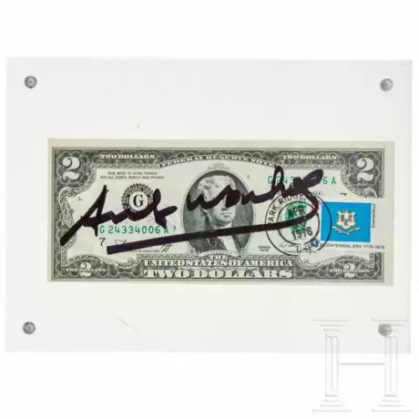 Signierter Zwei-Dollar-Schein mit Postmarke "Connecticut" und Poststempel von 1976. Verso gestempelt "Andy Warhol". Im Rahmen aus Acrylglas. Beiliegend ein zugehöriges Echtheitszertifikat der Galerie 32 in Nizza. Maße mit Rahmen 13,5 x 18,5 cm.