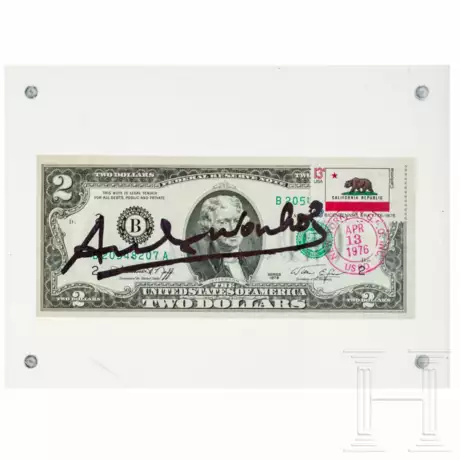 Signierter Zwei-Dollar-Schein mit Postmarke "California" und Poststempel von 1976. Verso gestempelt "Andy Warhol". Im Rahmen aus Acrylglas. Beiliegend ein zugehöriges Echtheitszertifikat der Galerie 32 in Nizza. Maße mit Rahmen 13,5 x 18,5 cm.