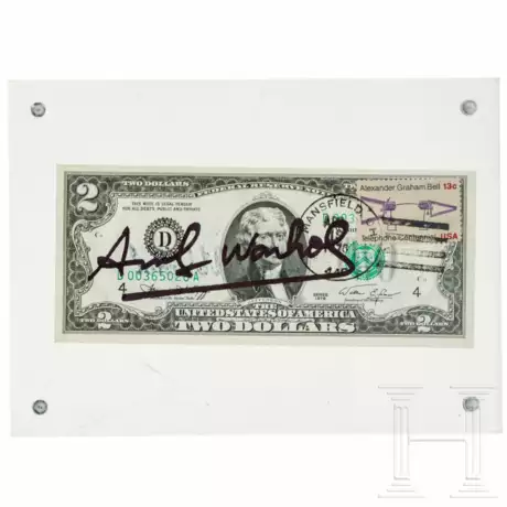 Signierter Zwei-Dollar-Schein mit Postmarke "Alexander Graham Bell / Telephone Centennial" und Poststempel von 1976. Verso gestempelt "Andy Warhol". Im Rahmen aus Acrylglas. Beiliegend ein zugehöriges Echtheitszertifikat der Galerie 32 in Nizza. Maße mit Rahmen 13,5 x 18,5 cm.
